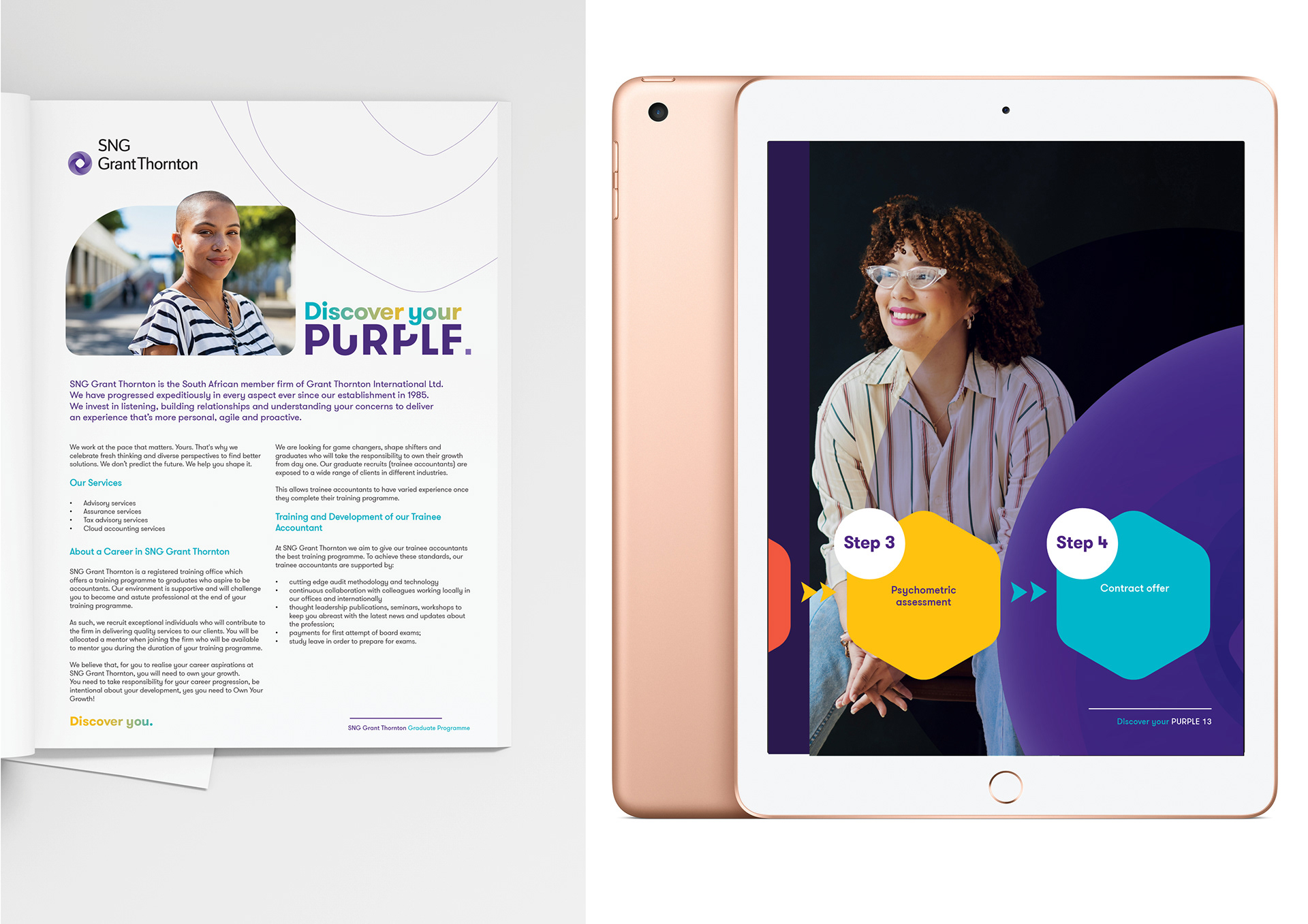 The identity was strategically constructed from the letters of the word ‘PURPLE,’ serving as a framework for incorporating imagery and a play on the colour of the brand. The campaign encourages graduates to explore their ‘PURPLE,’ serving as an acronym for Purpose, Uniqueness, Reach, Potential, Legacy, and Edge within this context.
